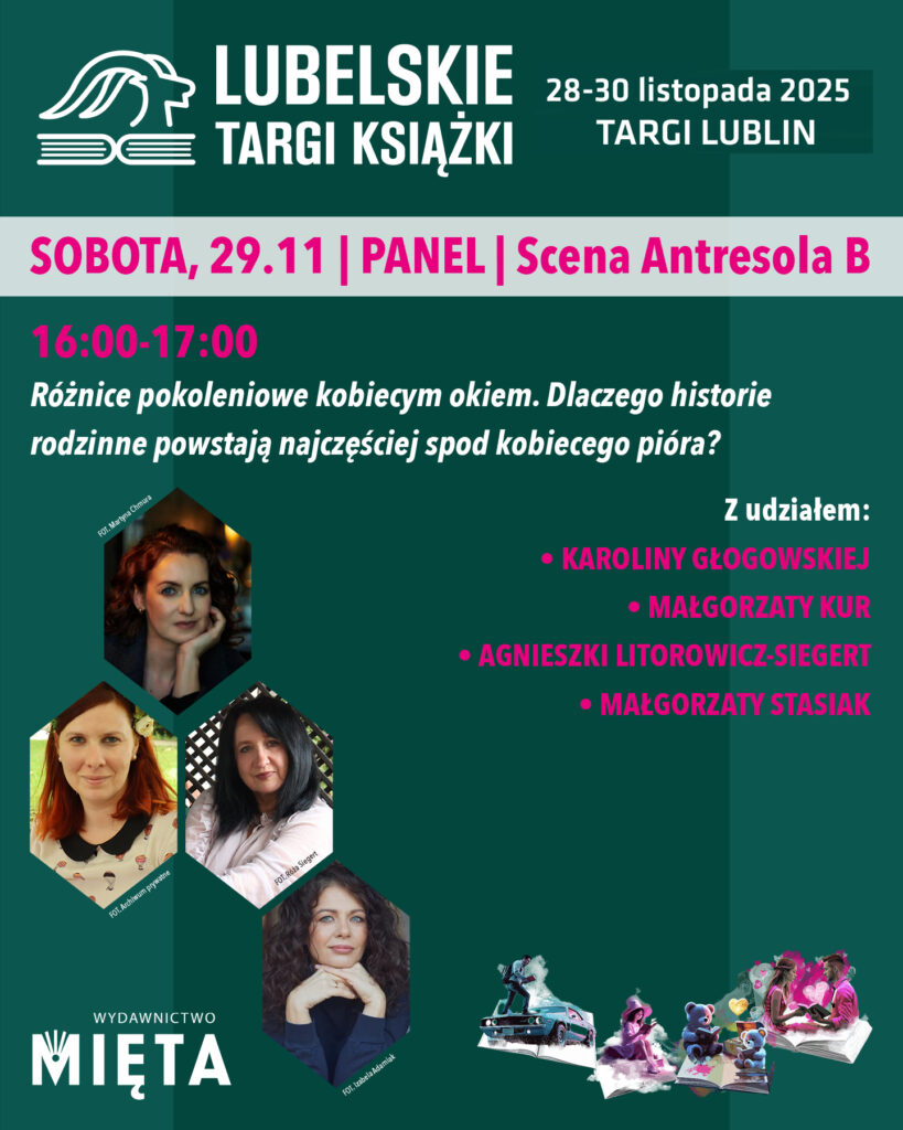 Szykujemy dla Was jak zawsze moc miętowych nowości, w tym Płacz Marty Kisiel, Usypiankę Karoliny Głogowskiej oraz Zatracenie Katarzyny Bereniki Miszczuk, ciekawe panele i warsztaty plastyczne dla dzieci. Nie zabraknie też dyżuru wydawniczego z Agnieszką Trzeszkowską-Berezą.
