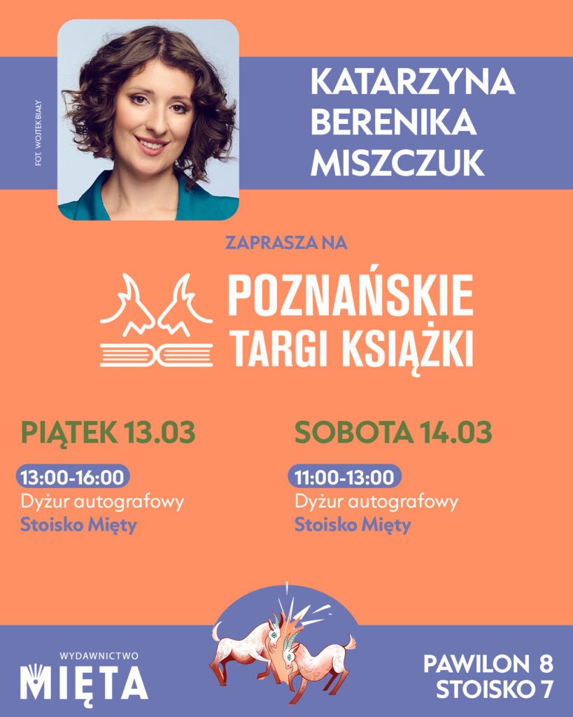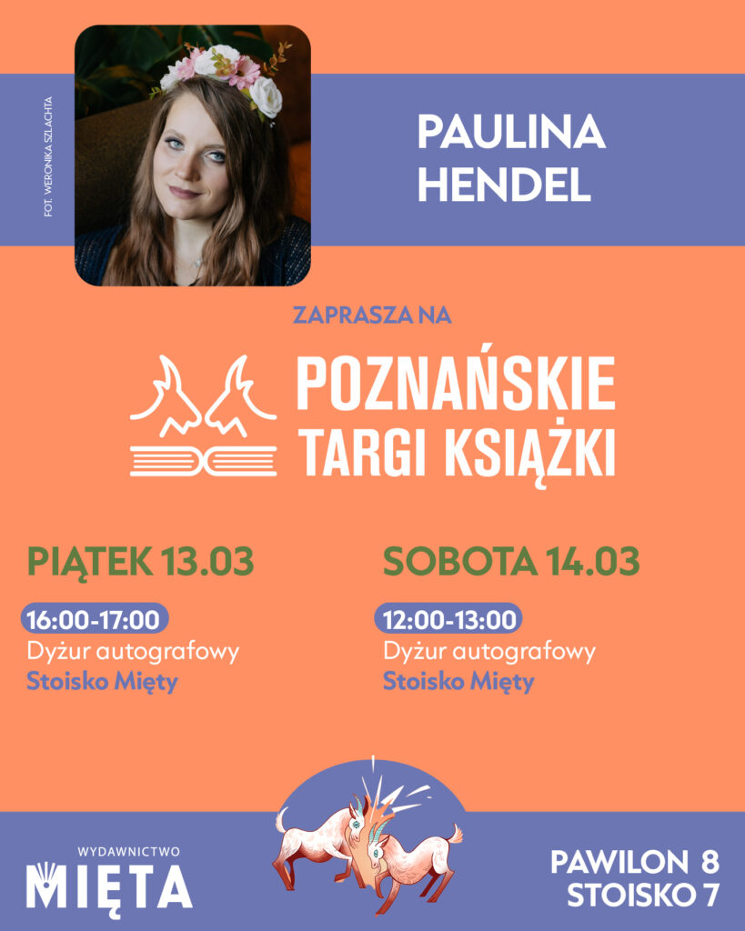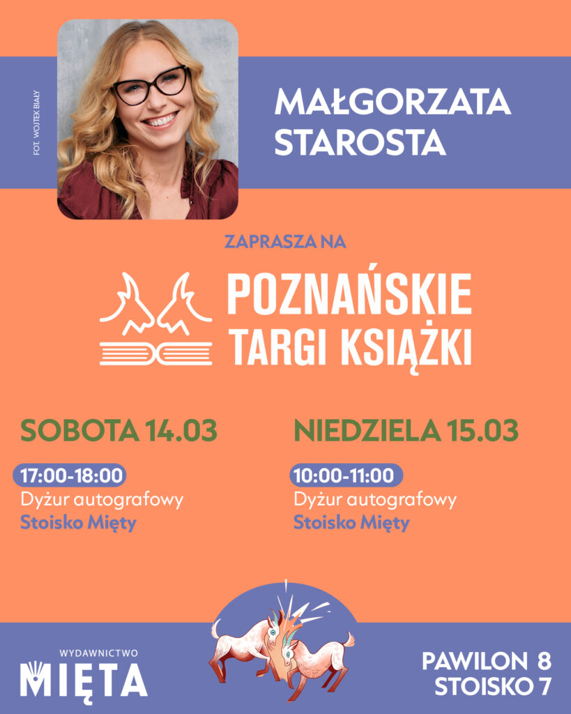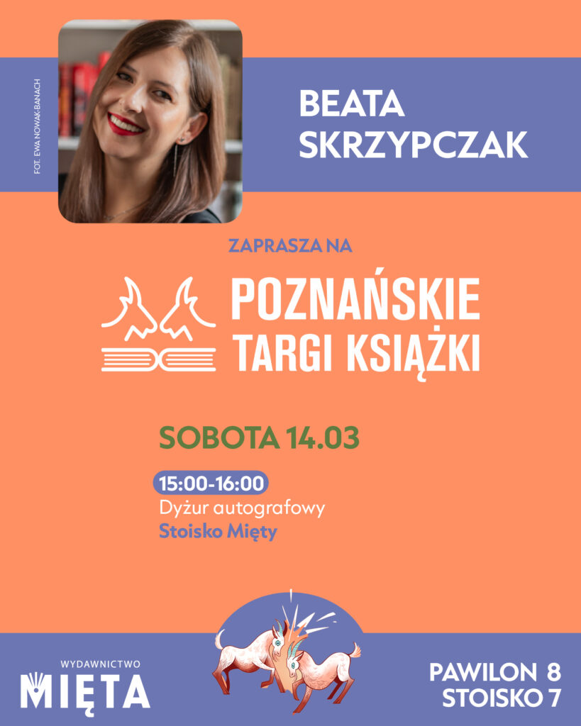 Serdecznie zapraszamy na Poznańskie Targi Książki. Wydarzenie, jak zawsze, odbędzie się na terenie Międzynarodowych Targów Poznańskich, ul. Głogowska 10, w dniach 13-15 marca 2026 r. Planujemy dla Was moc atrakcji. Będziecie mogli spotkać aż piętnaścioro miętowych autorów i posłuchać aż sześciu miętowych paneli i spotkań autorskich!