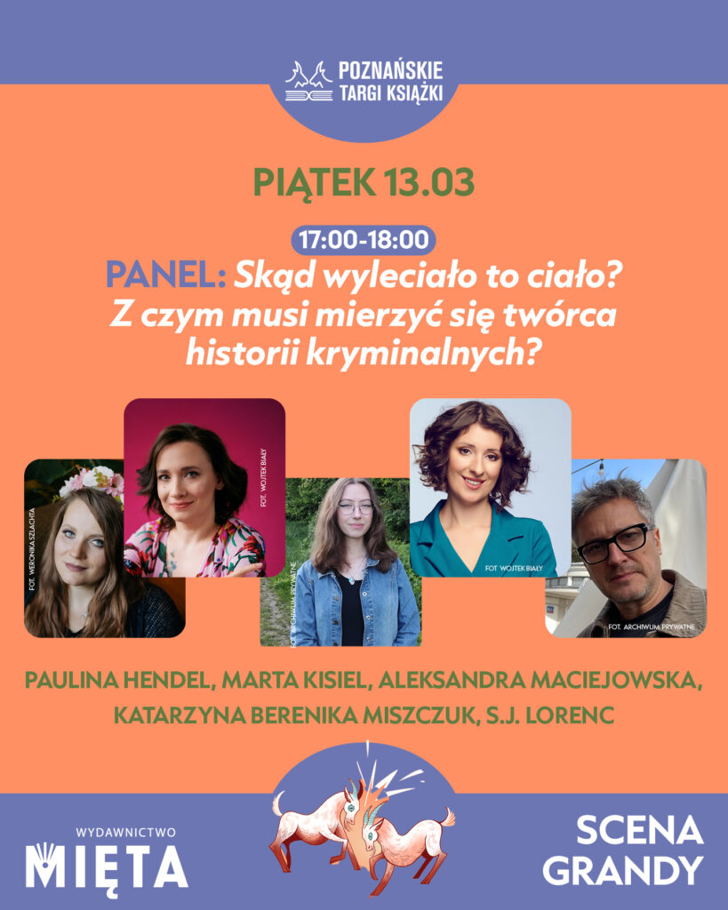 17:00-18:00 – Skąd wyleciało to ciało? Z czym musi mierzyć się twórca historii kryminalnych –Paulina Hendel, Marta Kisiel, S.J. Lorenc, Aleksandra Maciejowska orazKatarzyna Berenika Miszczuk w rozmowie zAgnieszką Trzeszkowską-Berezą – scena Grandy, pawilon 5A