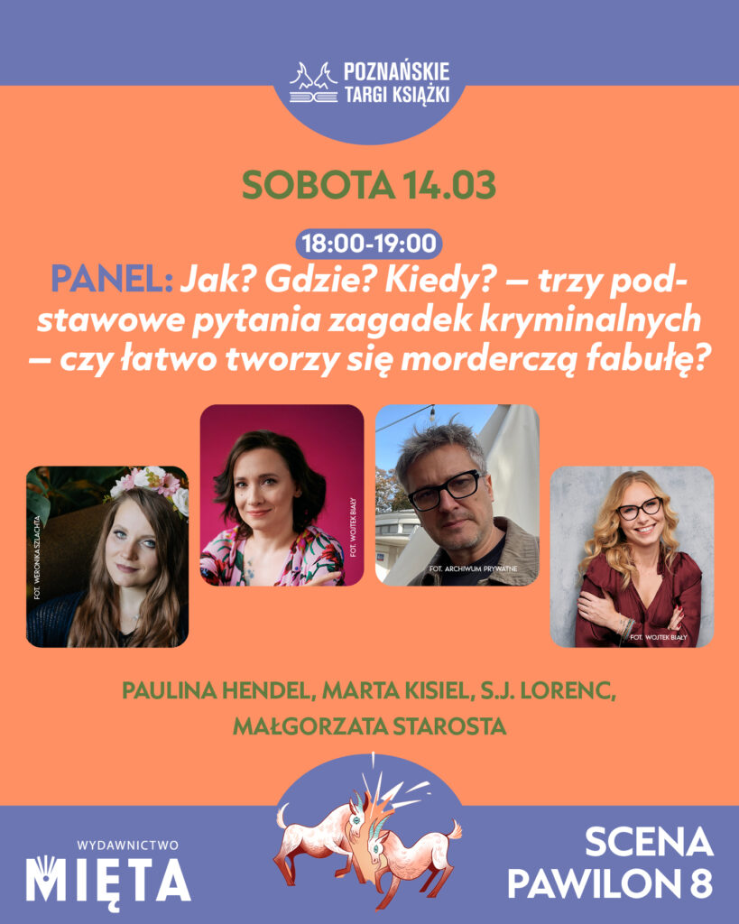18:00-19:00 – Jak? Gdzie? Kiedy? – trzy podstawowe pytania zagadek kryminalnych – czy łatwo tworzy się morderczą fabułę? opowiedzą Paulina Hendel, Marta Kisiel, S.J. Lorenc, Małgorzata Starosta. Prowadzenie: Krzysztof Skrzypski (@krzychu_and_book) – scena, pawlion 8