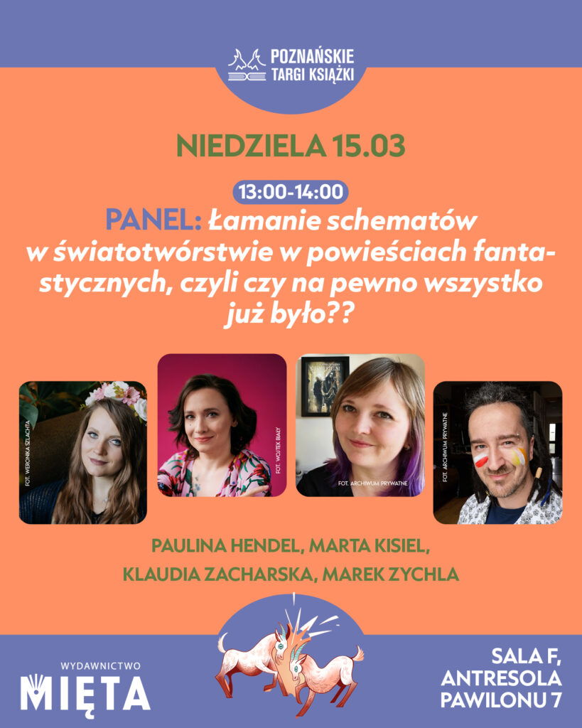 13:00-14:00  Łamanie schematów w światotwórstwie w powieściach fantastycznych, czyli czy na pewno wszystko już było? – Paulina Hendel, Marta Kisiel, Klaudia Zacharska oraz Marek Zychla w rozmowie z Agnieszką Trzeszkowską-Berezą – sala F, antresola pawilonu 7