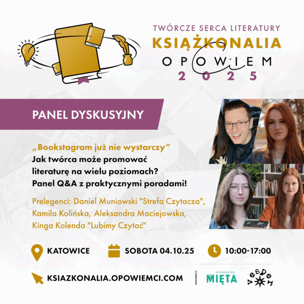Panel dyskusyjny: Bookstagram już nie wystarczy. Jak twórca może promować literaturę na wielu poziomach? Panel Q&A z praktycznymi poradami z udziałem Aleksandry Maciejowskiej „Humanistyczny bełkot”, Daniela Muniowskiego „Strefa Czytacza”, Kamili Kolińskiej „Zocharett” oraz Kingi kolendy „Lubimy Czytać”